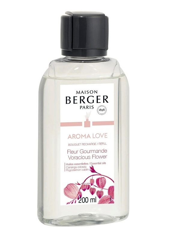 Náhradní náplň parfému pro aroma difuzéry Maison Berger Paris Aroma Love – Gurmánské květy povzbuzuje smysly a probouzí touhu. Hlavu parfému tvoří květy pomerančovníku a zelené tóny, tělo konvalinka a ylang-ylang. V základu parfému se pak mísí mořské tóny s vanilkou a pačuli.