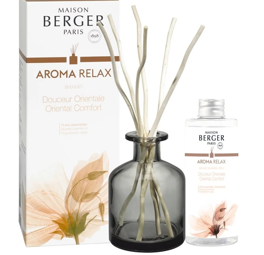 Dárkový set obsahuje šedý aroma difuzér francouzské značky Maison Berger Paris, 180 ml interiérového parfému s vůní Aroma Relax – Sladký Orient a 6 kusů vrbových vonných tyčinek.
