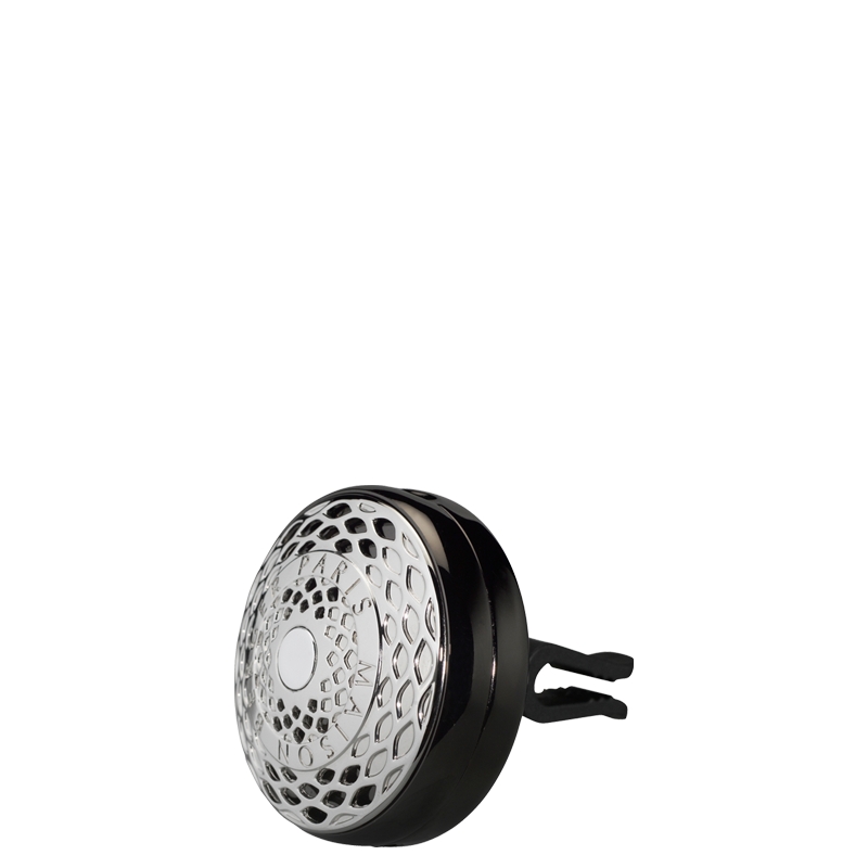 Jemný síťovaný design a stříbrná povrchová úprava doprovází tento nastavitelný difuzér do auta s luxusní vůní Golden Wheat (zlatavá pšenice).