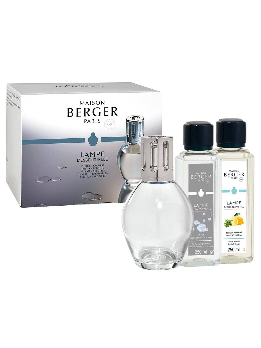Dárková sada Maison Berger Paris obsahuje katalytickou lampu Oval z kolekce Essential z průhledného skla a 250 ml interiérového parfému Verbena a 250 ml funkční náplně So Neutral.