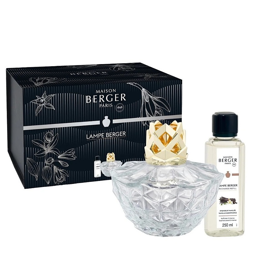 Nádherná katalytická lampa v transparentním provedení se zlatou korunkou od francouzské firmy Maison Berger.