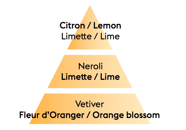 Příjemně svěží ovocná vůně se zářivými tóny čerstvě vymačkaných citrónů a limetek v kombinaci s vůní neroli a pomerančového květu.