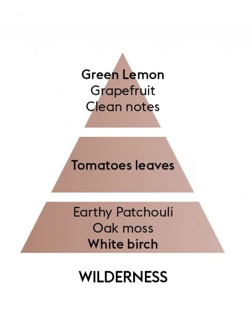 Interiérový parfém Divočina vás získá svou silnou podmanivou vůní. Ve svých vysokých tónech mísí vůně grepu, limetky s tóny čistoty. Zemitost parfému ucítíte prvně již ve středních tónech díky rajčatovým listům. Pačuli a bílé březové dřevo v nízkých tónech vyjadřují dobrodružný charakter parfému, zatímco mech uvolňuje silnou mužskou smyslnost.