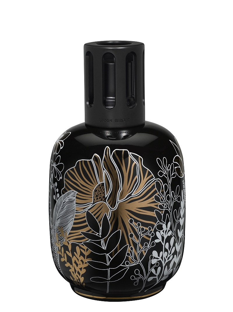 Luxusní porcelánová katalytická lampa v černé barvě, honosně zdobená květy, inspirovaná tradiční tapetou. Katalytická lampa je dodávána bez náplně. Doporučujeme nákup dárkového triopaku v oblíbený vůní.