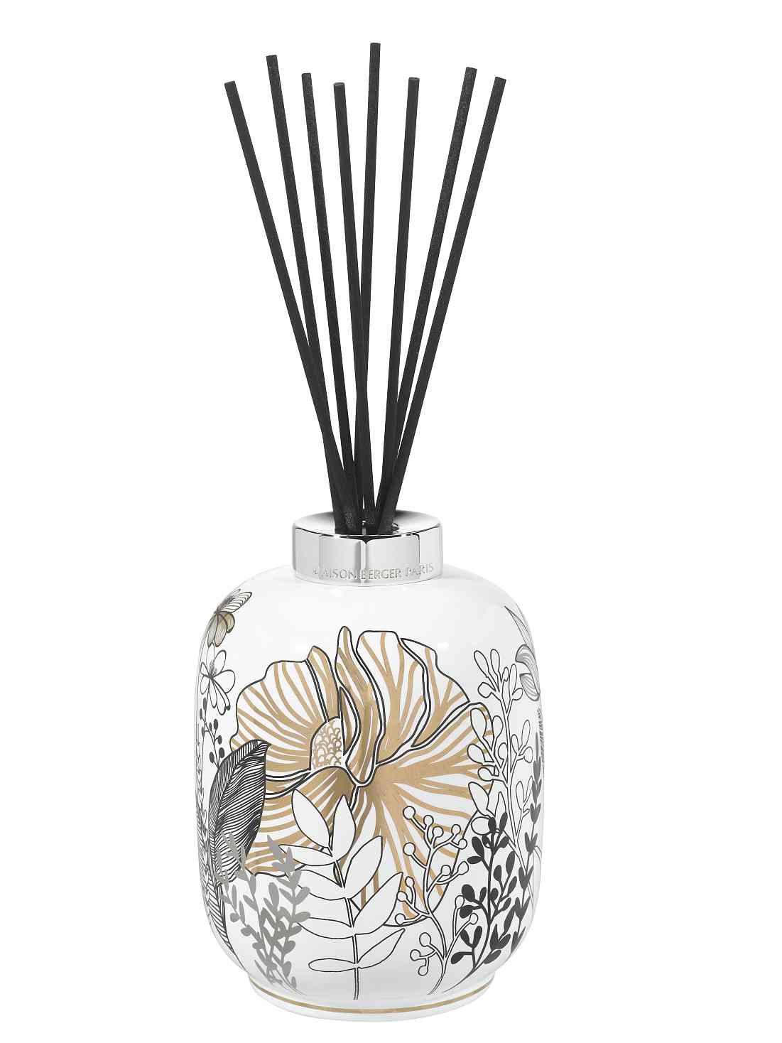 Luxusní porcelánový difuzér bez náplně od francouzské firmy Maison Berger. Je bohatě zdobený květy zlaté a černé barvy inspirovaný tradičními tapetami.