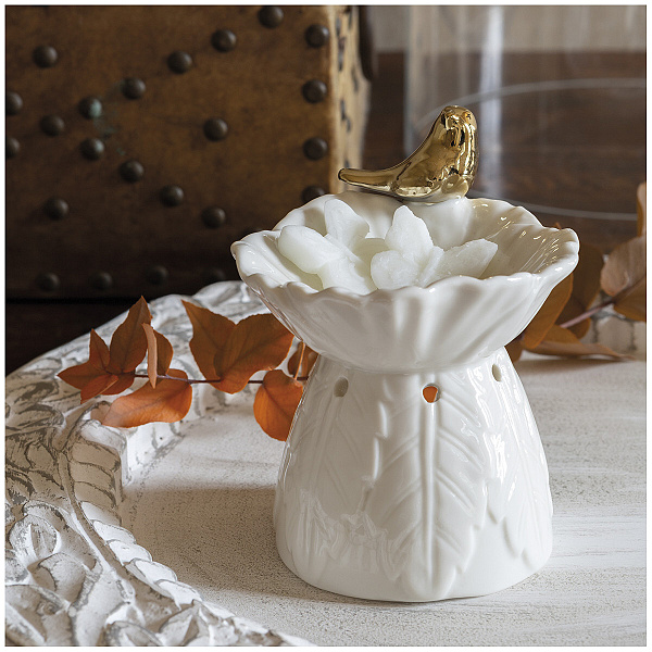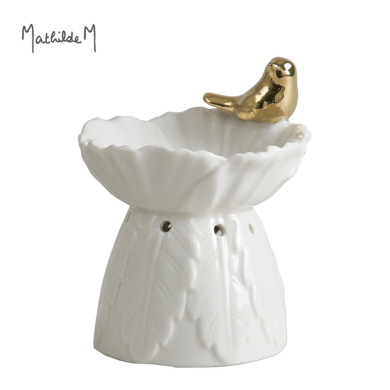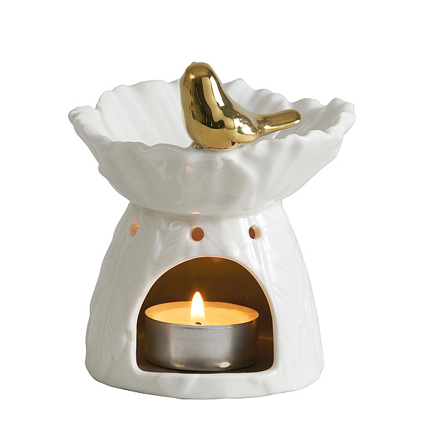 Poezie se pozve do vašeho interiéru s touto elegantní aromallampou zdobenou rostlinnými motivy a jemným zlatým ptáčkem. Provoní místnost a zároveň rozprostře jemnou záři své svíčky.