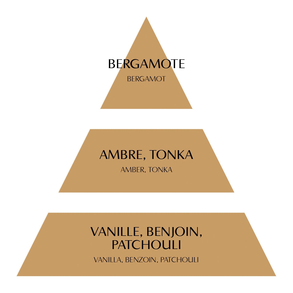 Teplá a smyslná vůně, opravdové čichové pohlazení. Svěžest bergamotu se otevírá dřevitým a jantarovým srdcem, zahřátým kadidlem. Dotek vanilky a pačuli prodlužuje tuto smyslnou a tajemnou stopu.