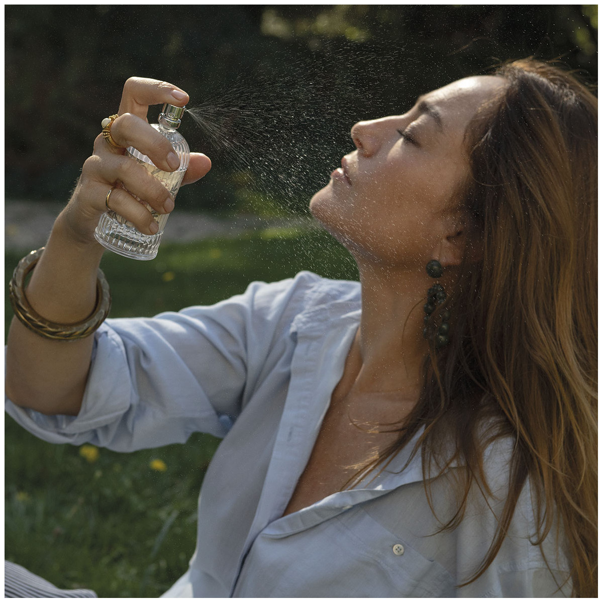 V nádherném závoji tato mlha lehce provoní tělo a vlasy. Jeho receptura složená z 95% složek přírodního původu a nízké koncentrace alkoholových parfémů bez poškození pokožky a vlasů vystavených slunci. Nechte se svést jeho elegantním designem inspirovaným 18. stoletím a zcela ručně kresleným, který odráží osobnost a jemné tóny doprovodného parfému.