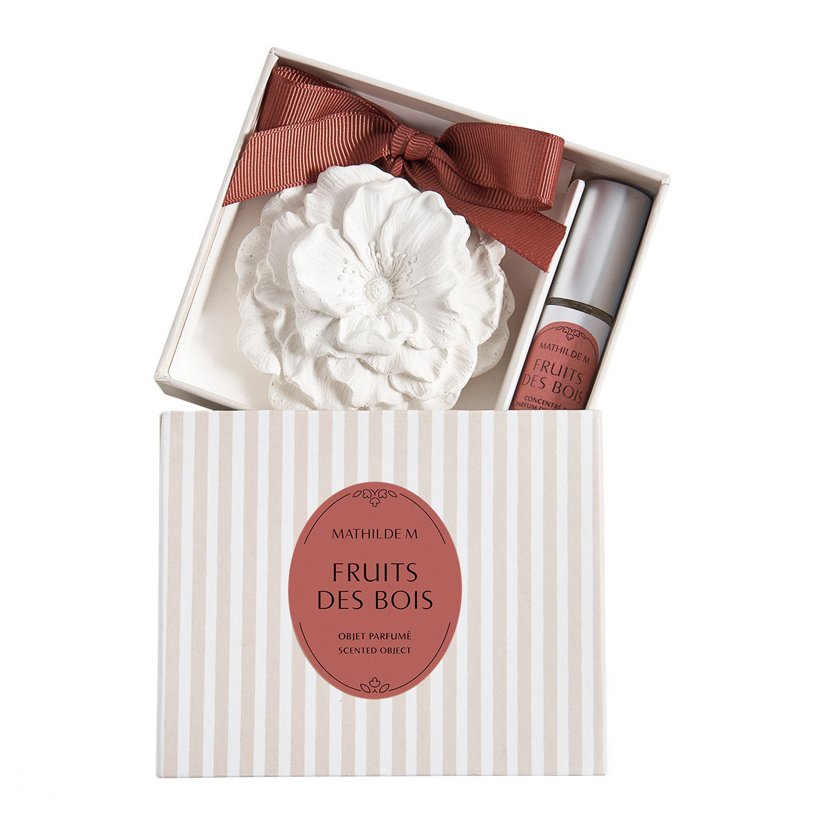 Dárková sada velkého vonného jílu a koncentrovaného spreje na jíly s vůní lesního ovoce od francouzské firmy Mathilde M. Doplnit můžete stojánkem nebo polštářkem na vonné jíly.