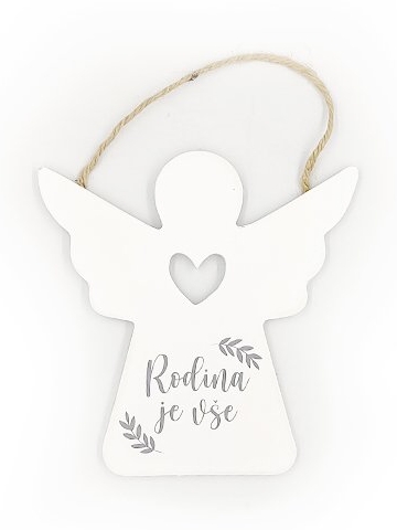 Dřevěná cedulka ve tvaru andílka s milým věnováním "Rodina je vše" obdarované zaručeně potěší vždy, když na ni pohlédnou a připomene, co je v životě opravdu důležité.