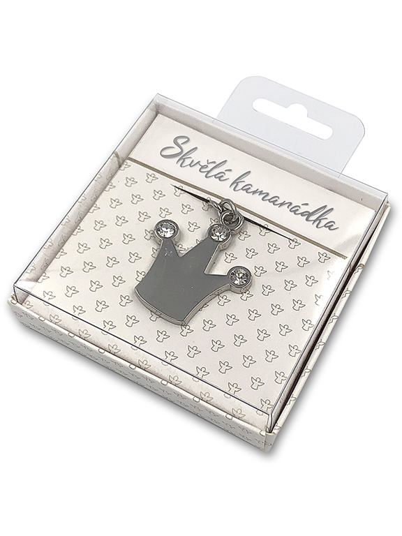 Nádherná kovová klíčenka ve tvaru korunky s lesklým povrchem a třemi kamínky jistě vykouzlí úsměv na tváři každé ženě. Na krabičce je napsáno věnování, klíčenka je bez popisu