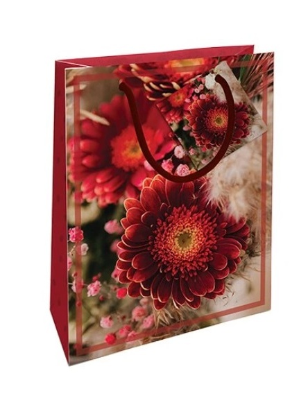 Tato dárková taška s foceným motivem červených gerber je vhodná k zabalení dárků pro ženy.