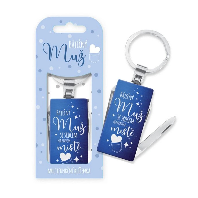 Kapesní nůž – klíčenka je designově sladěn i s ostatními dárky z kolekce „báječný muž se srdcem na pravém místě“. Můžete tak vytvořit sadu dárků, které jistě ocení. Jsou totiž praktické a milé současně.