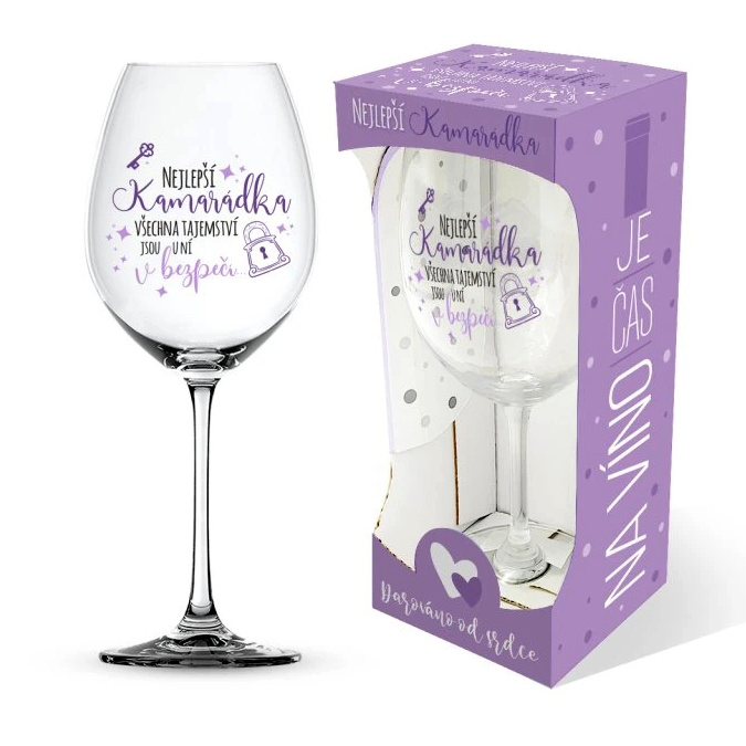 Sklenice na víno je designově sladěna i s ostatními dárky z kolekce „nejlepší kamarádka - všechna tajemství jsou u ní v bezpečí“. Můžete tak vytvořit sadu dárků, které jistě ocení. Jsou totiž praktické a milé současně.