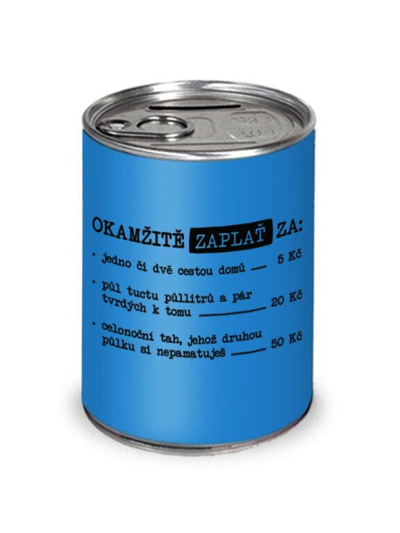 Tato humorná pokladnička ve tvaru plechovky vám pomůže zatočit s nadměrným pitím a nastartovat zdravější životní styl! Na zadní straně je výčet pokut, které musíte zaplatit za každý váš prohřešek.