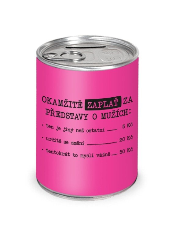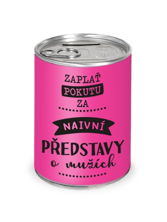 Jedná se o humornou pokladničku, která vypadá jako plechovka. Uvnitř se bude jistě skrývat spoustu mincí. A jak se tam ty mince dostanou? No přece tak, že zaplatíš pokutu za své naivní představy o mužích!