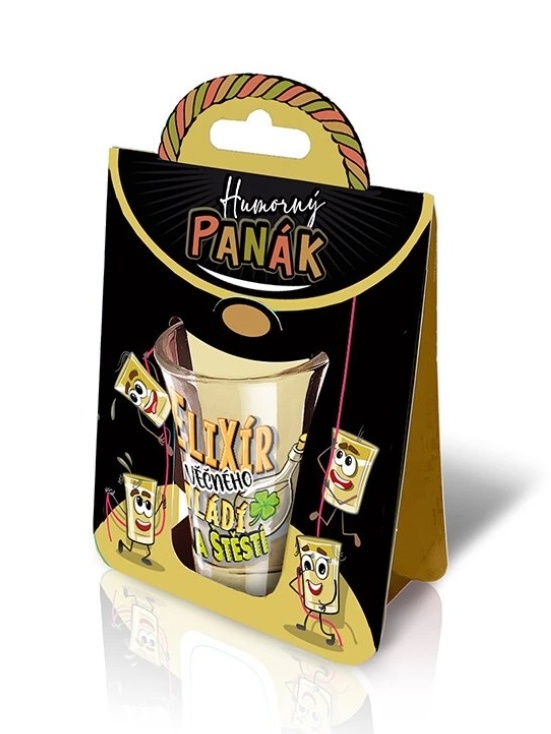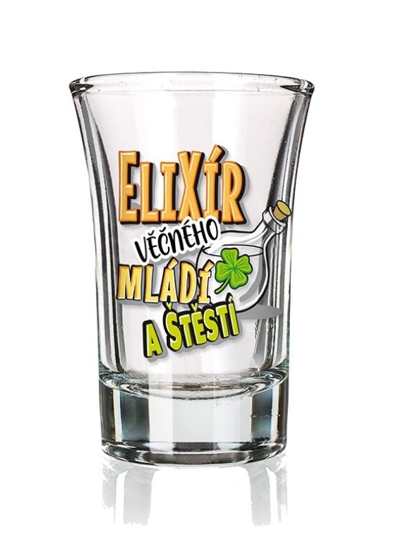 Hledáte perfektní dárek pro kamarády, které už nebaví stárnout a touží po nekonečné energii a bezstarostném životě? Pak je pro ně tento vtipný panák s textem "Elixír věčného mládí a štěstí" jako dělaný!