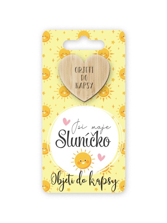 Kapesní objetí je malý a milý dárek darovaný od srdce, který udělá velkou radost. Dřevěný symbol ve tvaru srdce s textem "láska do kapsy" slouží jako štěstíčko. Na kartičce najdete milý text "Jsi moje sluníčko".