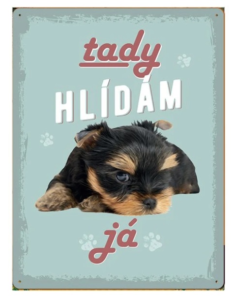 Retro plechová cedulka s textem "Tady hlídám já" je originální dekorace.