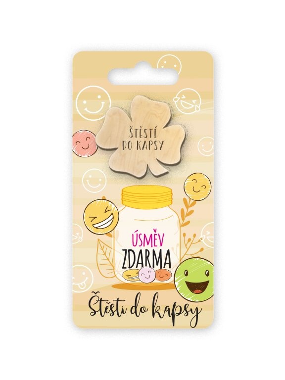 Kapesní objetí je malý a milý dárek darovaný od srdce, který udělá velkou radost. Dřevěný symbol ve tvaru čtyřlístku s textem "štěstí do kapsy" slouží jako štěstíčko. Na kartičce najdete milý text "Úsměv zdarma".