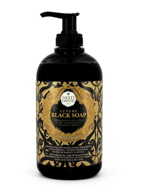 Luxury Black se zrodil z neustálého hledání dokonalosti Saponeria Nesti Dante. Vzácné černé tekuté mýdlo z Afriky se připravuje z aktivního uhlí získaného karbonizací kokosu. Aktivní rostlinné uhlí, známé pro své detoxikační a čistící vlastnosti, díky svému hloubkovému čištění podporuje obnovu buněk, pro hladkou, kompaktní a rozjasněnou pleť. Opojný a kořenitý tón pačuli a růžového pepře spolu se svěžestí hyacintu a jasmínu odhaluje tornádo smyslnosti a nečekané opulentnosti.