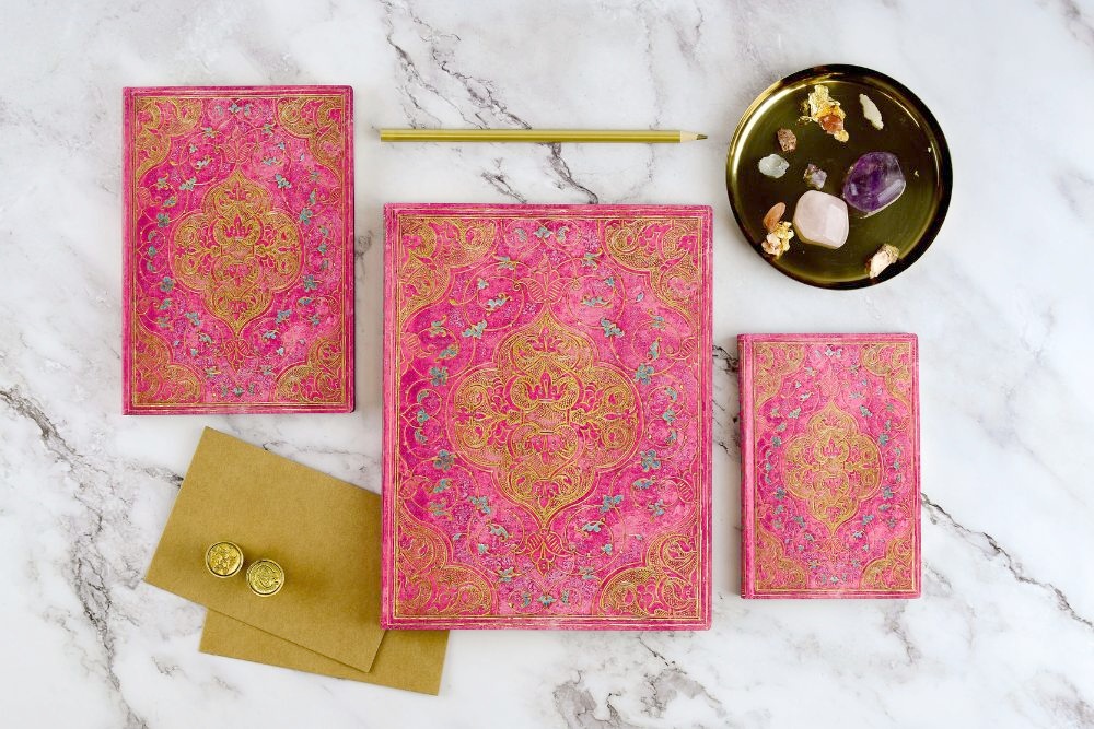 Tato obálka je založena na vazbě pro knihu s názvem Chroniques , kterou vydal Salel Binder v Paříži v roce 1514. V hojnosti designu se odráží nádhera renesančního přístupu k dekoraci. Na této růžové obálce deníku můžete vidět spletitost svých vlastních příběhů.