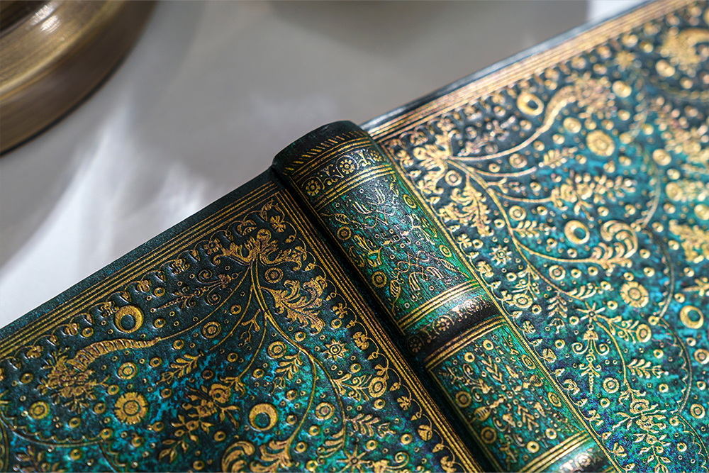 Náš design Smaragdového květu , inspirovaný irskou knižní vazbou z roku 1760, která obsahovala Knihu obyčejných modliteb (The Book of Common Prayer) , což byl standardní text používaný při anglikánských církevních bohoslužbách, je zdoben růžovými větvičkami a rohy hojnosti, které připomínají hojnost přírodní úrody na Den díkůvzdání.