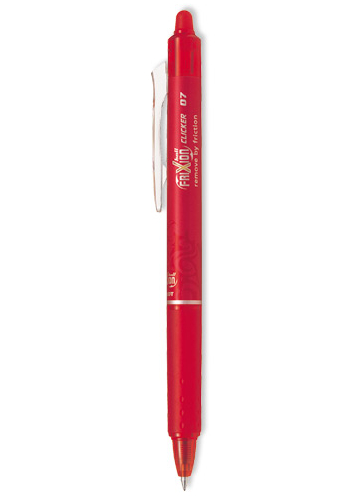Napiš ... Vygumuj ... A přepiš s rollerem FriXion se stiskacím mechanismem! Vygumujte beze zbytků pomocí tepla, které vzniká třením gumovacího hrotu FriXion o papír, a který nezanechává žádné zbytky. Použijte stejné pero (inkoust) pro psaní a přepsání. Použijte roller FriXion Ball Clicker s patentovaným termosenzitivním inkoustem, se kterým - jako již tradičně - přináší Pilot revoluci v psaní! Nepoužívejte k podepisování oficiálních dokumentů, u právních dokumentů, při zkouškách nebo při práci s jinými dokumenty, jejichž obsah musí mít trvalý charakter.
