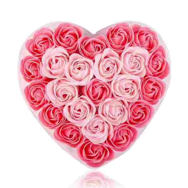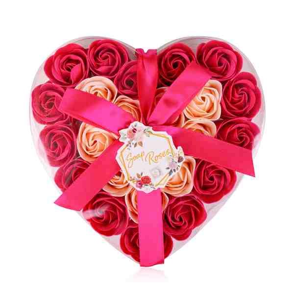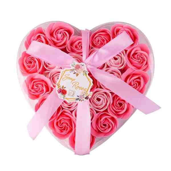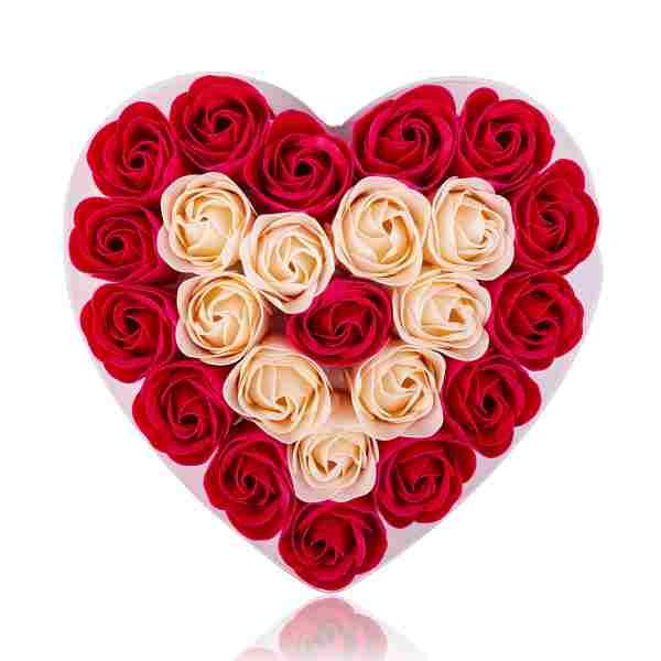 Romantické mýdlové květy růží zabalené v boxu ve tvaru srdce převázané stuhou.