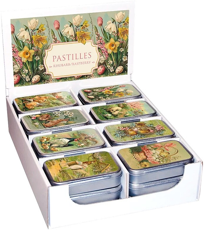 Dopřejte si lahodné pastilky s příchutí rebarbory a malin, balené ve stylové plechové dóze s velikonočním motivem. Díky ochranným vnitřním sáčkům zůstávají pastilky vždy čerstvé a chráněné před vlhkostí. Ideální jako sladká drobnost pro sebe nebo jako dárek. Expirace až 2 roky. Hmotnost pastilek cca 55 g. Perfektní jako drobný dárek nebo stylový doplněk do kabelky či na cestování. Ochutnejte sladkou kombinaci rebarbory a malin! Skvělý tip na velikonoční dárek!