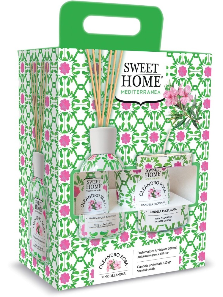 Kolekce Středomoří - dárková sada vonného difuzéru 100ml a vonné svíčky 110g s vůní Oleandro rosa/ Oleandr růžový .