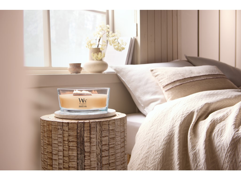 Loď je nejvýraznějším provedením WoodWick a smyslovým středobodem prostoru. Její protáhlý tvar a široký dřevěný knot vytvářejí intenzivní, hřejivý zvuk praskajícího ohně, který okamžitě přitahuje pozornost a uklidňuje. Organický design zesiluje světelný i zvukový efekt a proměňuje zapálení svíčky v hlubší rituál. Prostor se ztiší, tempo zpomalí a atmosféra získá přirozenou hloubku. Loď je ideální pro chvíle, kdy chceš být skutečně v přítomnosti a nechat se unést klidem, teplem a pocitem spojení s přírodou. TIP: Pro rovnoměrné hoření nechte svíčku při každém zapálení rozpustit až ke kraji.
