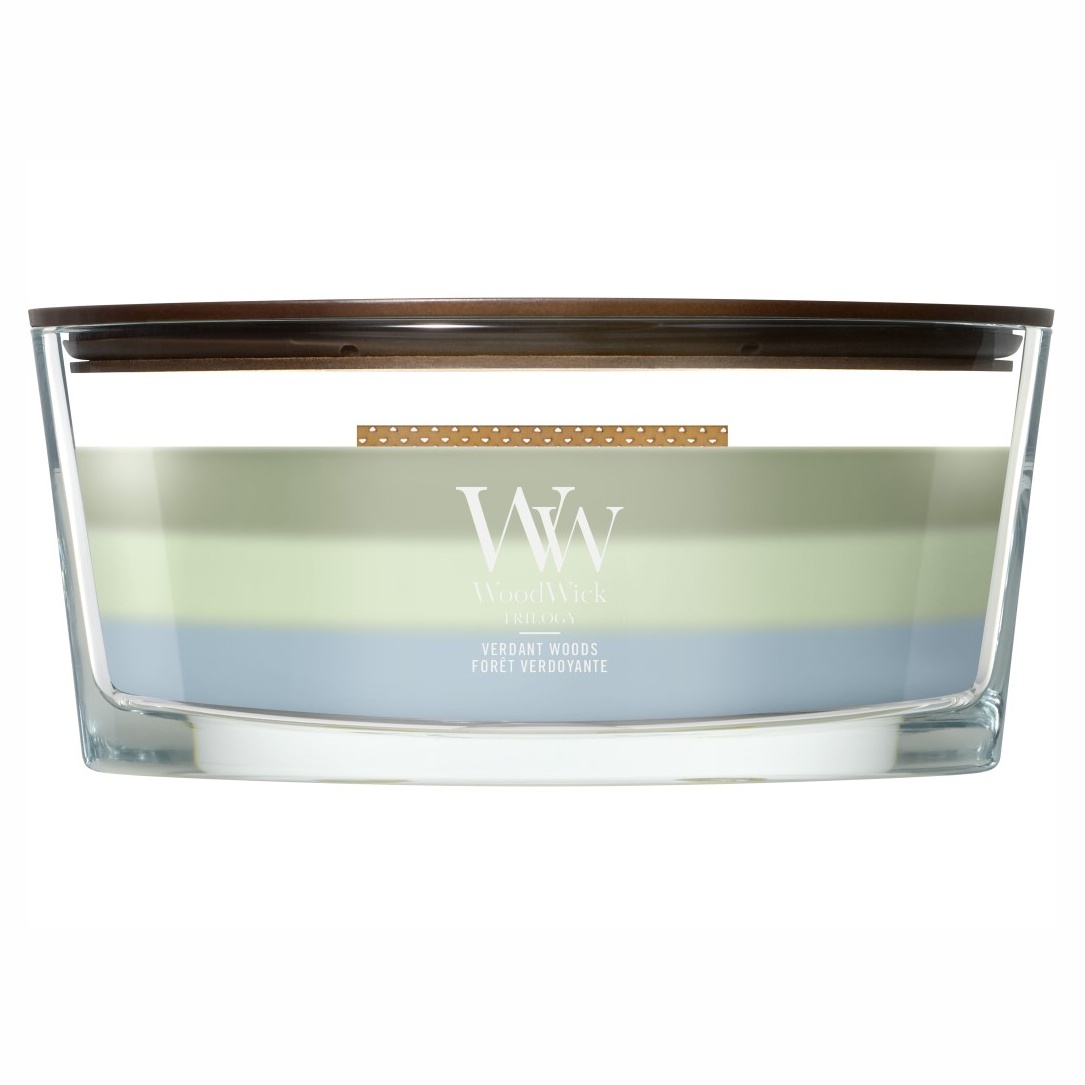 Vonná svíčka WoodWick Trilogy Verdant Woods, široký knot 453 g