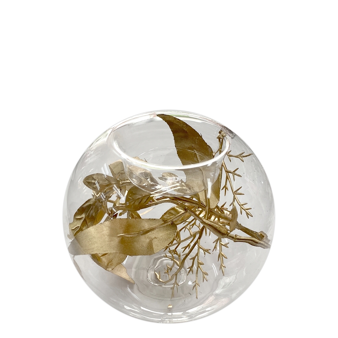 Skleněný svícínek na čajové svíčky, který má uvnitř dekoraci z růžového zlata.