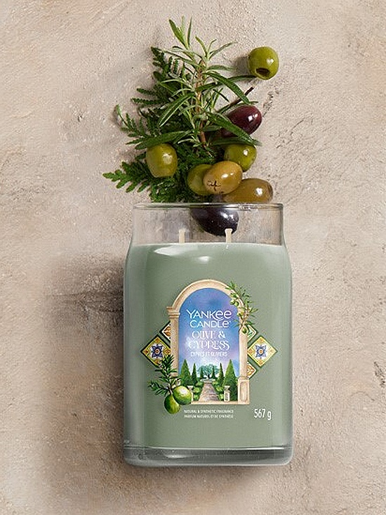 • detail Yankee Candle OLIVE & CYPRESS, signature velká svíčka 567g