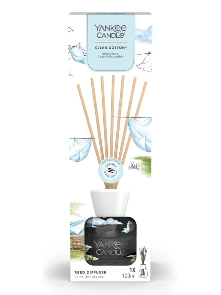 Yankee Candle Signature Reed Difuzér Clean Cotton (100 ml) je perfektní volbou pro celodenní provonění a zároveň dodává vašemu interiéru nádech stylu díky atraktivnímu ručně ilustrovanému designu a opakovaně použitelné skleněné nádobce.